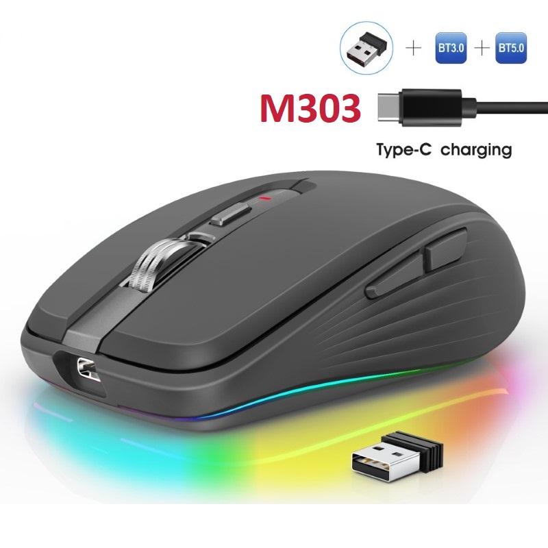 . Chuột Led Không Dây M303 Đa kết nối Bluetooth 5.0 + Usb 2.4G Pin sạc TypeC chống ồn nhỏ gọn. Thiết kế công thái học , chống đau mỏi cổ tay khi dùng lâu. Led RGB chạy màu liên tục nhiều hiệu ứng , ...- Giao hàng toàn quốc