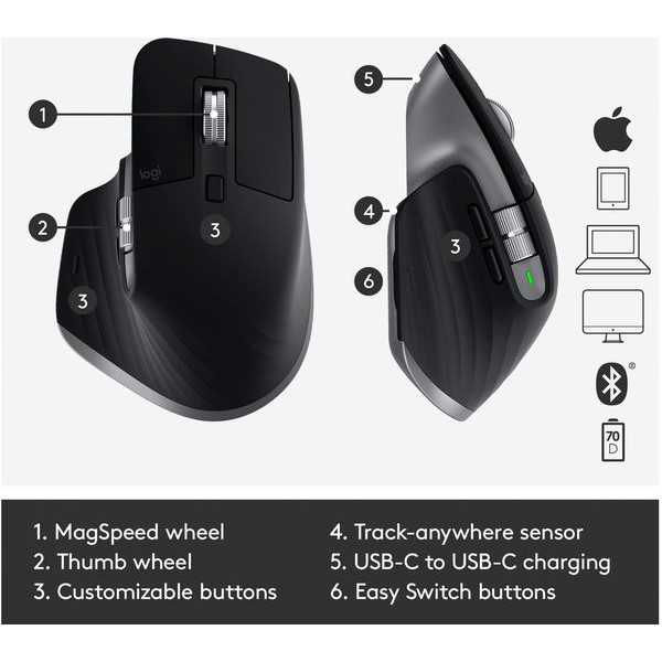 MX Master 3 duy trì hoạt động tối đa 70 ngày cho một lần sạc đầy - và nhận được ba giờ sử dụng từ một lần sạc nhanh trong một phút. Sử dụng cáp sạc USB-C đi kèm để nạp điện.