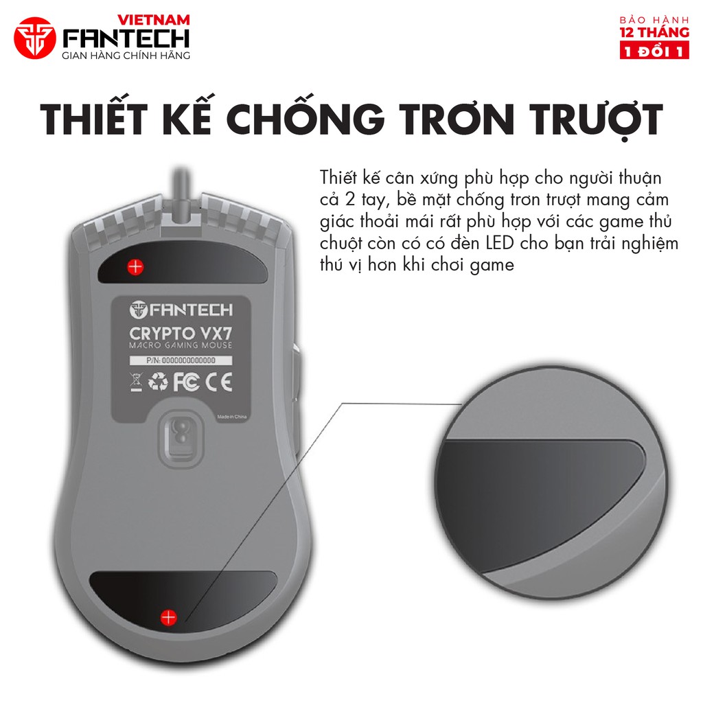 - Chuột máy tính Gaming FANTECH VX7 CRYPTO có thiết kế cân xứng phù hợp cho người thuận cả 2 tay, bề mặt chống trơn trượt mang cảm giác thoải mái rất phù hợp với các game thủ, chuột còn có có đèn LED cho bạn trải nghiệm thú vị hơn khi chơi game.