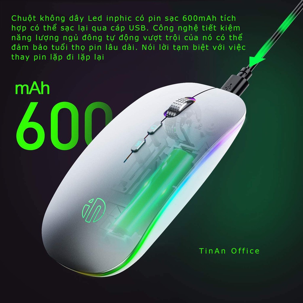 Chuột không dây Led inphic có pin sạc 600mAh tích hợp có thể sạc lại qua cáp USB.