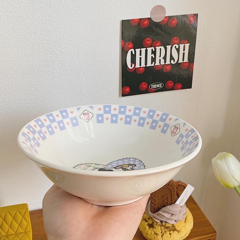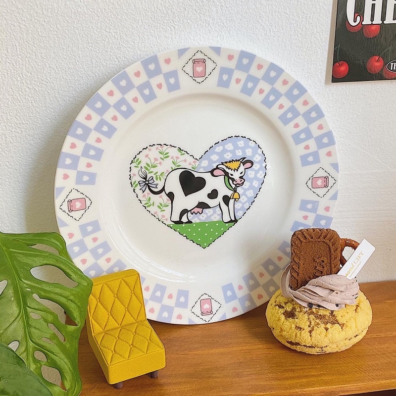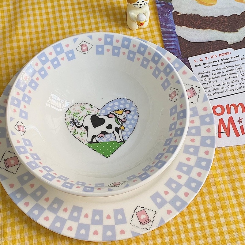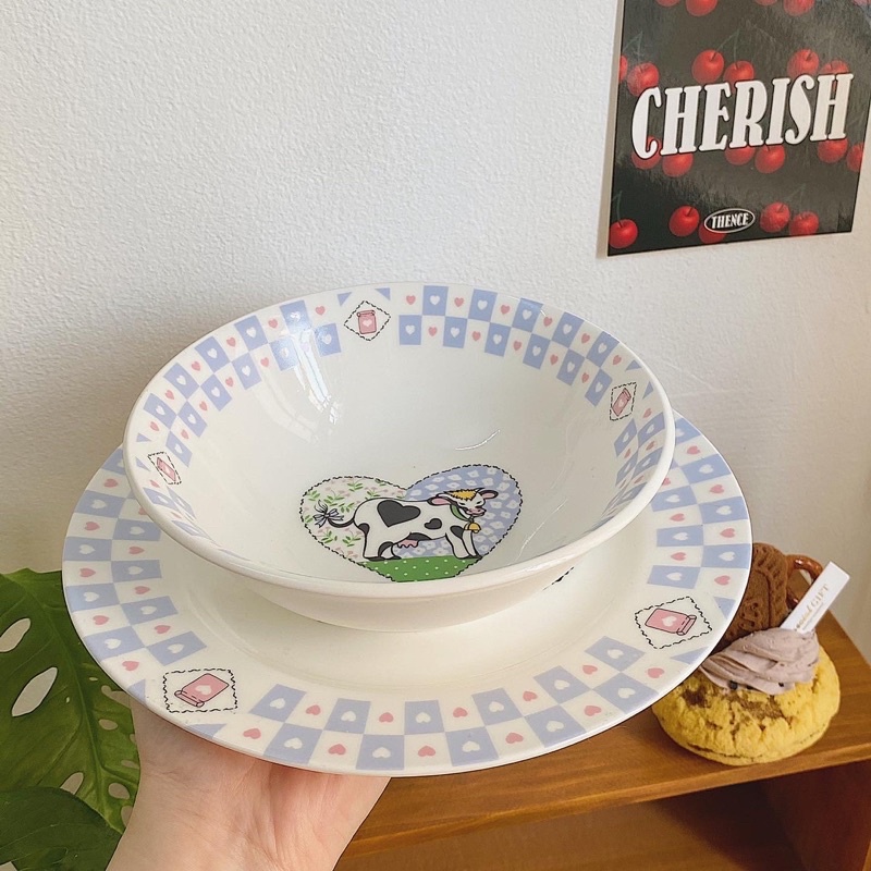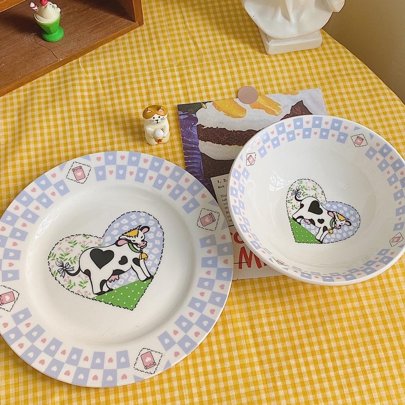 Đĩa và bát bò sữa 🐄 🌸Em bò sữa cute phối màu xanh caro pastel viền đĩa tăng thêm phần xinh xắn 🌙🍳🥯🥐