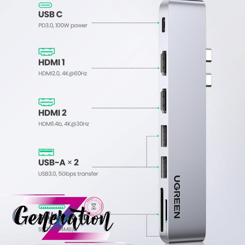 Giới thiệu Bộ chuyển 2 USB Type-c ra 2 cổng USB3.0+2 cổng HDMI+TF/SD + USB-C - Hub USB C 7 trong 2 cho Macbook Pro/Air Ugreen 80548
