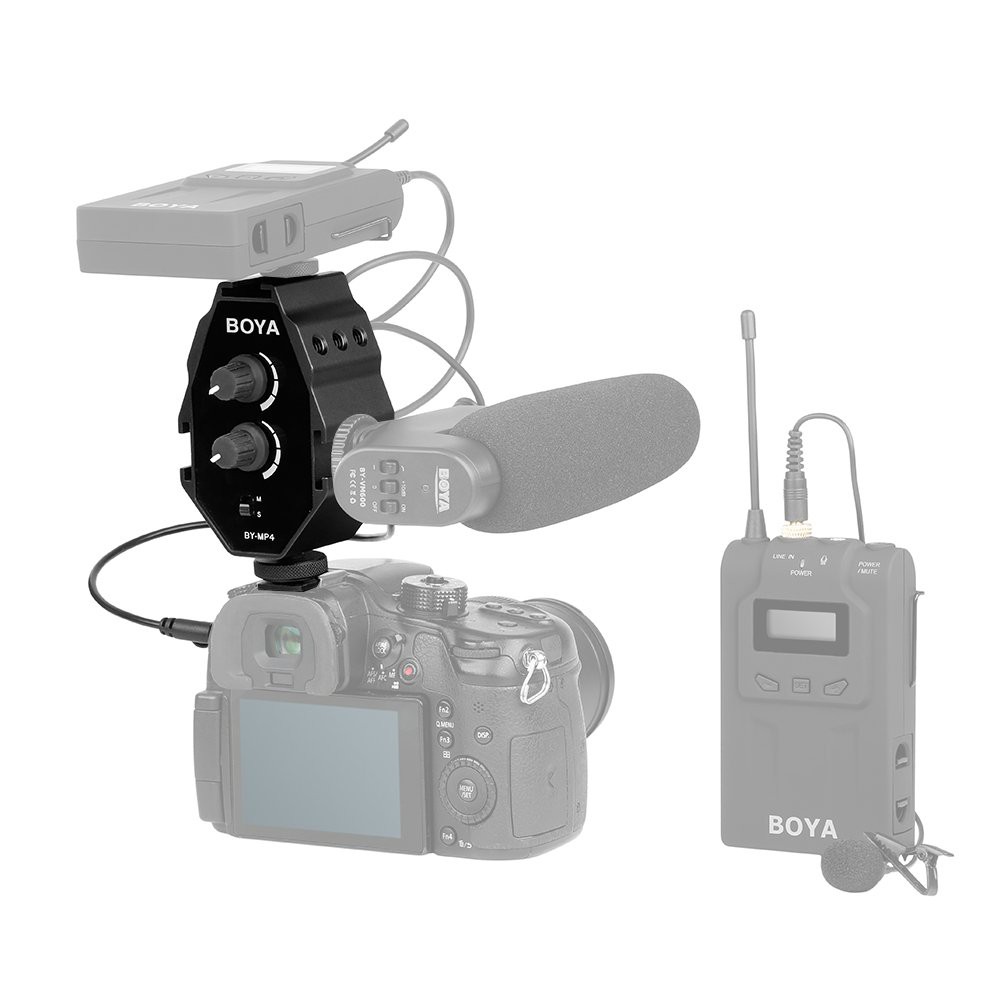 ◾ BOYA BY-MP4 là bộ chuyển đổi âm thanh 2 kênh, với cáp TRRS 3,5mm và cáp TRS 3,5mm cho phép bạn quay video bằng điện thoại thông minh, máy ảnh DSLR hoặc máy quay phim.◾ Bộ chuyển đổi này giúp bạn có thể trộn âm thanh và gắn mic kép nhỏ gọn, cho phép bạn có thể dễ dàng gắn và điều khiển hai micrô hoặc máy thu không dây.