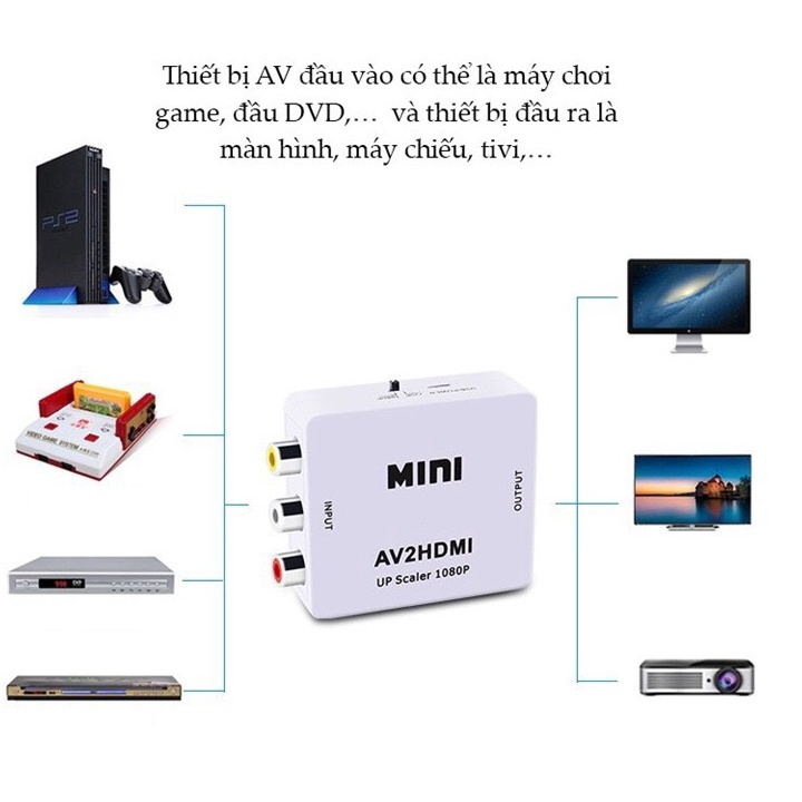 -Định dạng tín hiệu đầu vào: AV (đỏ, vàng và trắng) âm thanh và video tổng hợp CVBS. -Tín hiệu đầu ra: HDMI 1080p 60Hz/720P 60Hz.
