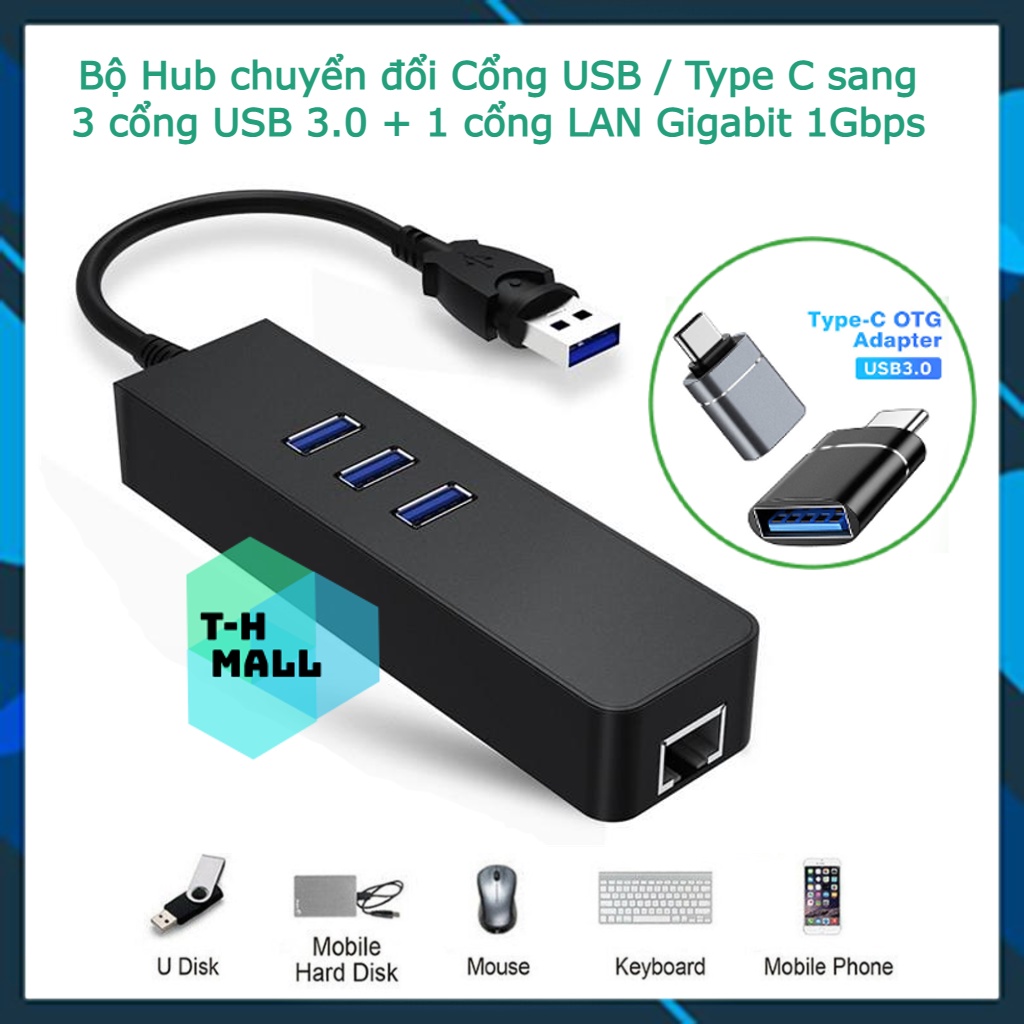 - LAN 1gbps + Type C : Hub chuyển đổi USB A sang 1 cổng RJ45 tốc độ 1000Mbps, kèm đầu chuyển đổi sang Type C 3.0 dùng cho macbook và laptop đời mới có cổng Type C