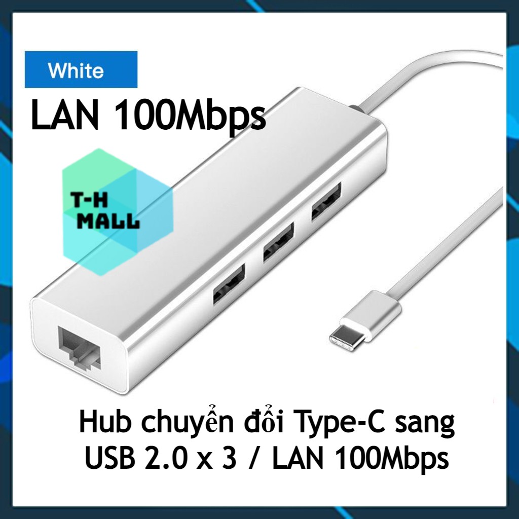 - 2 in 1 USB/RJ45 : Vỏ nhựa, chuyển Type-C / USB sang 3 cổng USB2.0 + 1 cổng RJ45 tốc độ 100Mbps