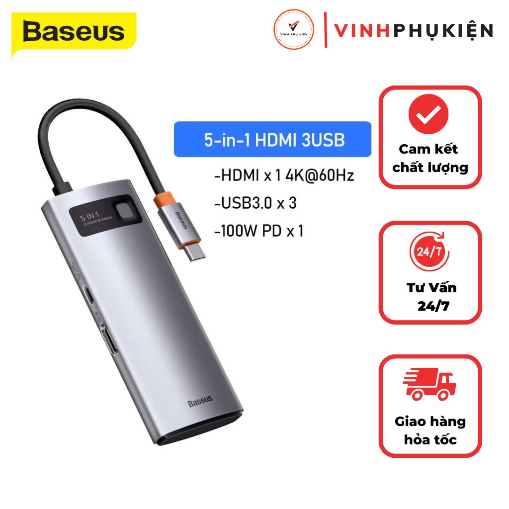 Bộ chuyển đổi hub 5 in 1 typec to hdmi 4k 3 chân usb 3.0 pd 100w cho laptop macbook chính hãng baseus