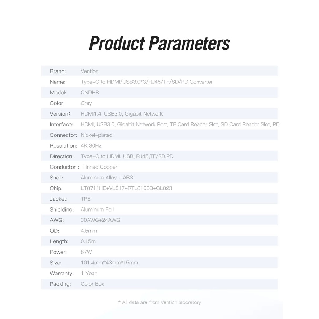 - 8 in 1 Vention 【 USB3.0 x 3 + HDMI + RJ45 1000Mbps + Micro + SD + PD 87W】