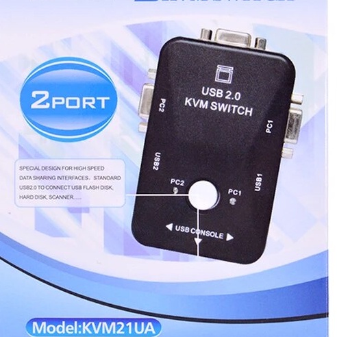 Bộ chuyển đổi KVM 2 cổng xuất từ 2 PC ra chung một màn hìnhKVM là biện phát lý tưởng cho các văn phòng nhà nơi các tập tin kinh doanh được lưu giữ trên một máy tính và tập tin cá nhân trên khác.