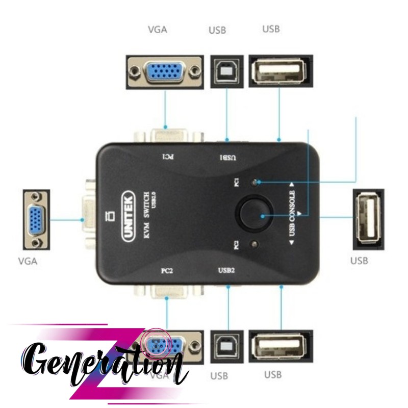 KVM VGA USB USB 2PC -1màn hình UNITEK U-8709- Đầu vào 2 cổng VGA (tương ứng sử dụng kết nối với 2 case máy tính).
