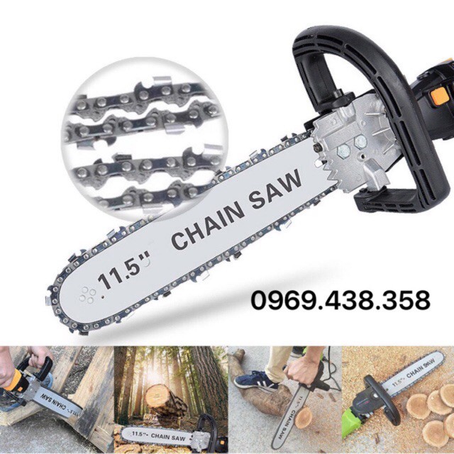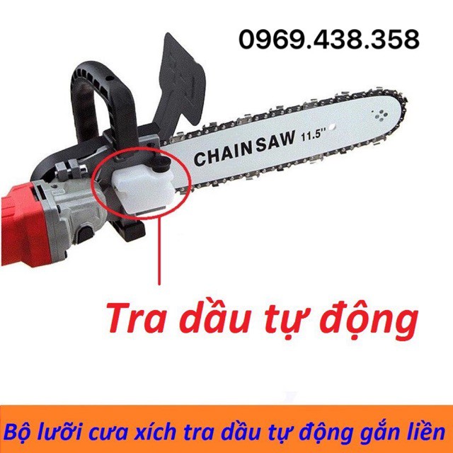 Mô tả sản phẩm Bộ lưỡi cưa xích gắn máy mài - Loại Xịn có bình tra dầu tự động gắn liền.Công dụng: lắp vào máy mài để tạo thành máy cưa gỗ