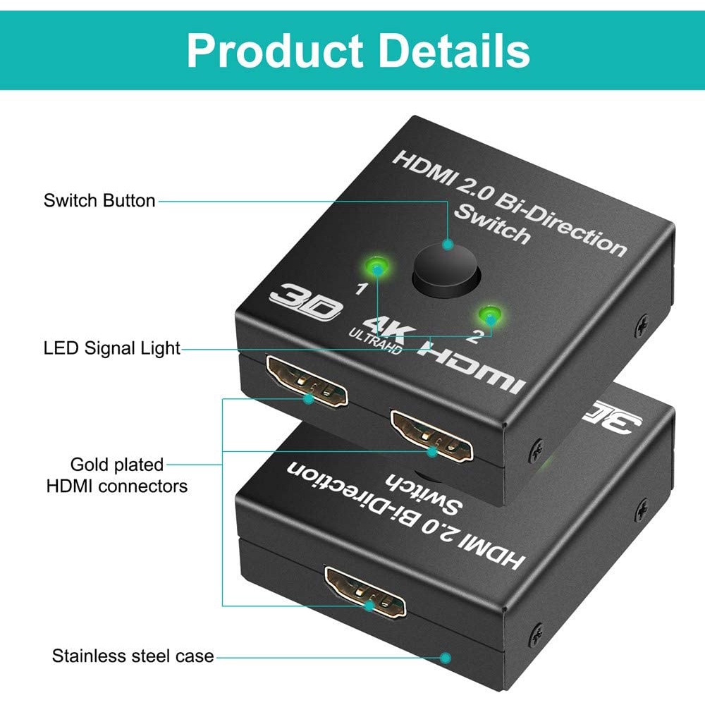 - Đây là một thiết bị hiệu suất cao 2 HDMI vào 1 HDMI ra hoặc 1 HDMI vào và 2 HDMI ra chuyển đổi kỹ thuật số / audio. Nó hỗ trợ chức năng repeater HDCP và nhanh chóng chuyển đổi cổng đầu vào HDMI.