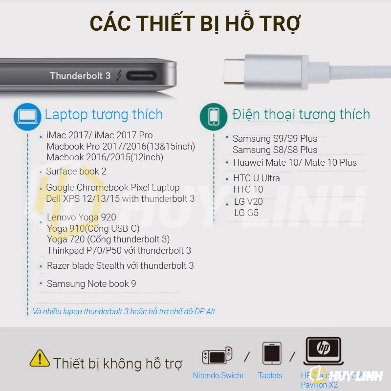 * Chỉ tương thích với Loại C điện thoại/máy tính bảng có hỗ trợ USB-C Chế Độ DP Alt. Không phải tất cả Type-C điện thoại/máy tính bảng tương thích. Để kiểm tra thiết bị có tương thích kiểm tra tại đây: http://www.mhltech.org/devices.aspx