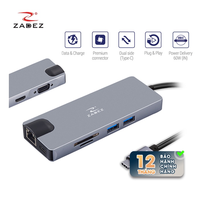ZADEZ ZAH-518 là thiết bị mở rộng kết nối chuẩn Type-C (USB-C), bổ sung thêm cổng HDMI cho phép truyền hình ảnh siêu nét với độ phân giải 4K (30 Hz), cổng kết nối màn hình chuẩn VGA tiện dụng, cổng cáp mạng LAN chuẩn RJ-45, 2 cổng đọc thẻ nhớ, cổng sạc IN chuẩn Type-C ™ theo công nghệ Power Delivery (60W) và cổng USB 3.0 cho phép bạn kết nối các thiết bị USB như máy ảnh kỹ thuật số, điện thoại, ổ cứng ngoài, ổ đĩa flash v.v. (hỗ trợ tốc độ truyền dữ liệu lên tới 4.8 Gbps). ZADEZ ZAH-518 không yêu cầu bất kỳ phần mềm hoặc quy trình cài đặt phức tạp nào, chỉ cần cắm nó vào máy tính và sử dụng.ZADEZ ZAH-518