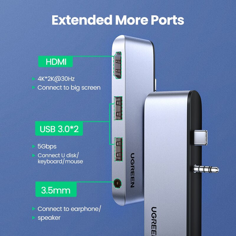 - Mở rộng nhiều cổng hơn: cổng hdmi (4K*2K@30Hz) + 2 cổng USB 3.0 + cổng 3,5mm;