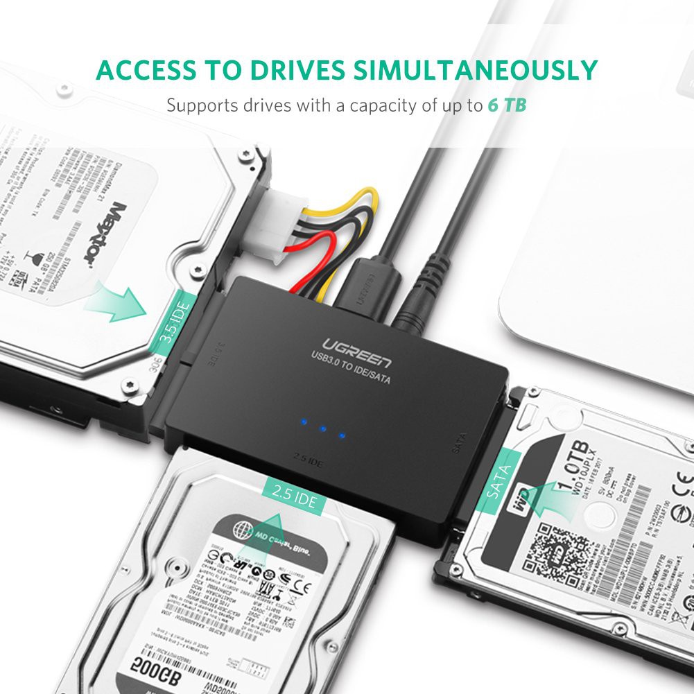 Bộ chuyển đổi USB 3.0 to SATA/IDE Ugreen 30353Box đọc ổ cứng SATA và IDE Ugreen 30353 là thiết bị chuyên dụng để kết nối sao chép dữ liệu từ ổ cứng Sata hoặc IDE với máy tính, laptop, macbook của bạn một cách đơn giản thông qua cổng USB 3.0 với tốc độ truyên tải dữ liệu nhanh chóng lên đến 5Gbps. Giải pháp hoàn hảo cho các nhu cầu sao chép dữ liệu giữa nhiều ổ cứng hoặc dung lượng file lớn cùng một lúc. Hỗ trợ đọc và đồng bộ dữ liệu đồng thời từ 3 ổ cứng. Ngoài ra bạn còn có thể kết nối ổ đĩa DVD hoặc CD với máy tính của mình thật dễ dàng và tiện lợi.
