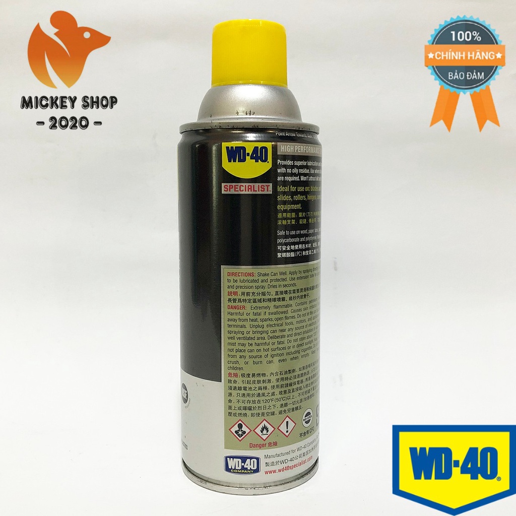 [ CHUYÊN DỤNG ] Dầu nhờn khô, tác dụng cao WD-40 High Performance Dry Lube 360ml - CHÍNH HÃNGMICKEY 2020 SHOP xin giới thiệu sản phẩm Mỡ bò khô bôi trơn WD-40 Specialist High Performance Dry Lube (360ml) Chứa PTFE (polytetrafluoroethylene) nhằm tăng cường chất bôi trơn và bảo vệ, để lại một lớp màng mỏng khô giúp bôi trơn, chống ẩm, chống bám bụi bẩn và dầu. Khô nhanh và tốt như chất chống dính khuôn.