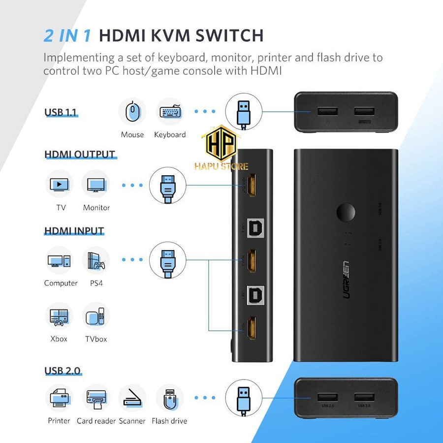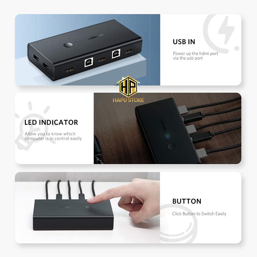 Máy tính & Laptop > Thiết Bị Mạng > Bộ Chuyển Mạch KMV || Bộ chuyển KVM Switch 2 vào 1 ra Ugreen 50744 chuẩn HDMI màu đen chính hãng - HapustoreCòn hàng