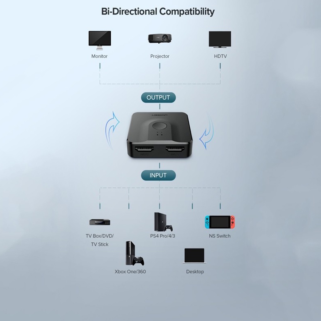 - Ugreen 50966 cũng có thể hoạt động như một bộ chia HDMI, cho phép bạn kết nối thiết bị chính của mình với 2 TV, màn hình hoặc máy chiếu khi bạn cắm các thiết bị này vào cổng input trên thiết bị, cổng còn lại cắm vào thiết bị phát. Bạn có thể chuyển đổi giữa 2 màn hình, lựa chọn màn hình hiển thị, chỉ có 1 màn hình hiển thị cho video đầu ra, không hiển thị cùng lúc 2 màn hình được.