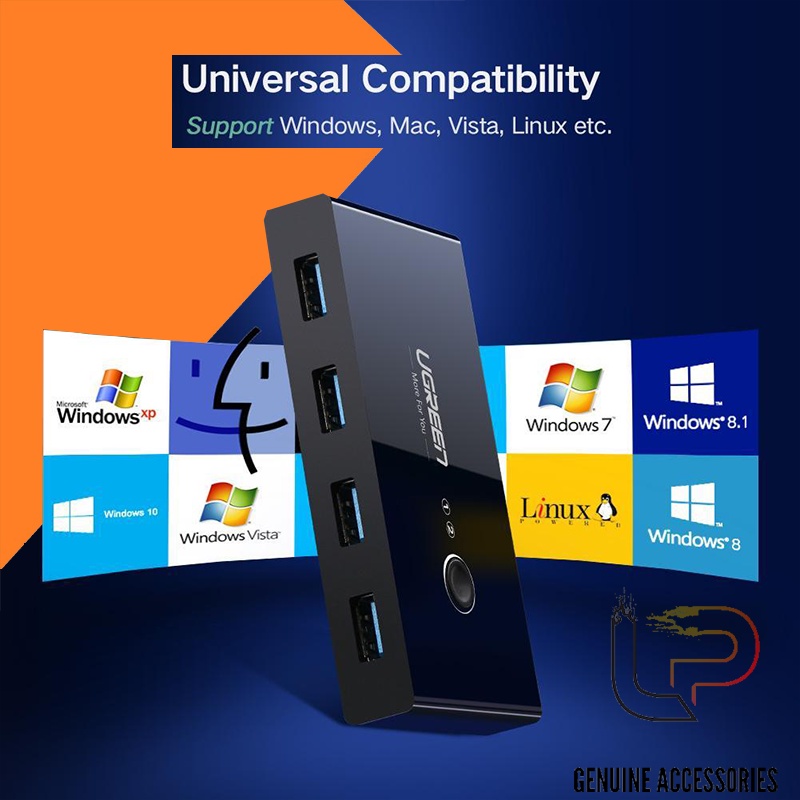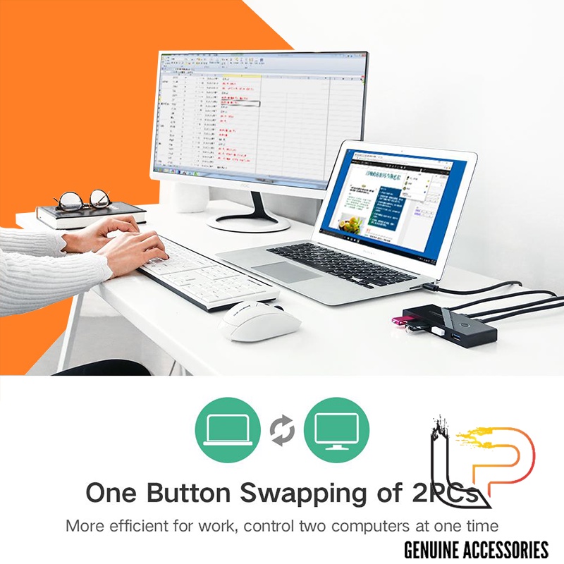 Chia sẻ 4 thiết bị USB 3.0 giữa hai hệ thốngThiết bị USB Switch 4 Port này cho phép tối đa 2 người dùng chia sẻ 4 thiết bị ngoại vi USB 3.0, chẳng hạn như máy in, máy quét, chuột, bàn phím hoặc đĩa USB, v.v. mà không cần phải liên tục hoán đổi cáp hoặc thiết lập phần mềm chia sẻ mạng phức tạp. Nó là một lựa chọn tuyệt vời để sử dụng tại nhà nếu bạn có nhiều PC hoặc Mac.