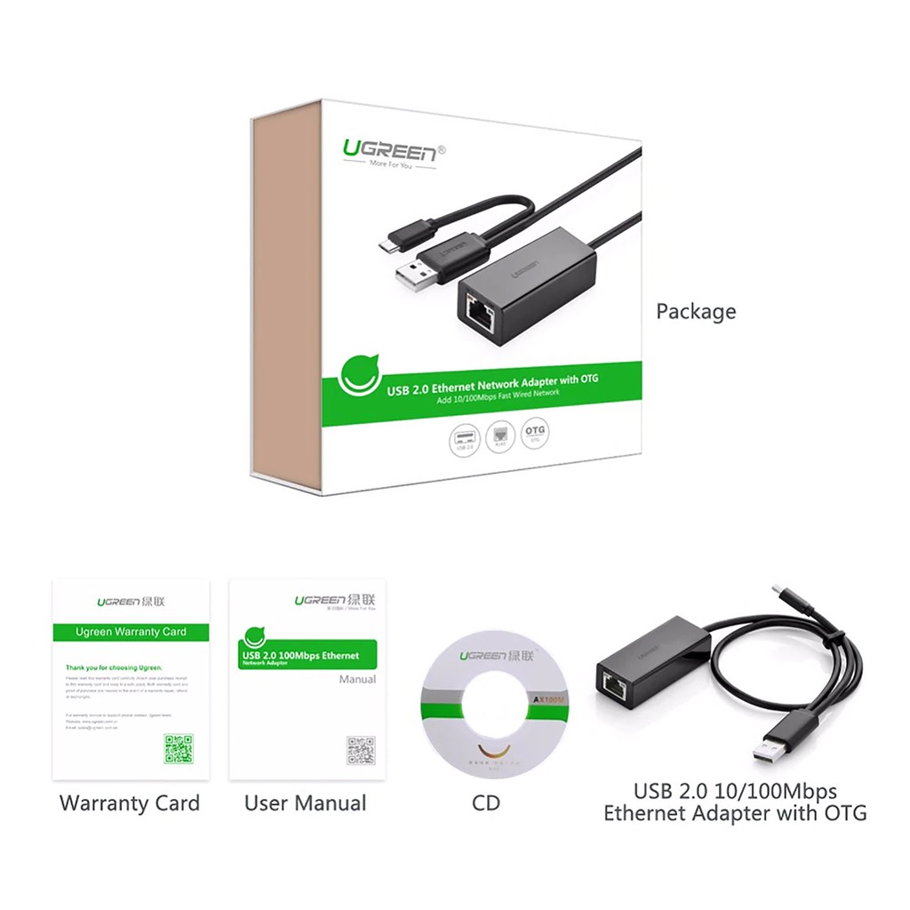 Bộ Chuyển Micro USB & USB 2.0 Ra LAN Cao Cấp UGREEN 30219 là cáp chuyển đổi USB 2.0 với mạng Lan RJ45 được sử dụng thay thế cổng mạng trên máy tính xách tay, PC... sử dụng cáp OTG để kết nối mạng Lan cho các thiết bị hỗ trợ OTG như máy tính bảng thông qua chuẩn Micro USB.Thông tin sản phẩm