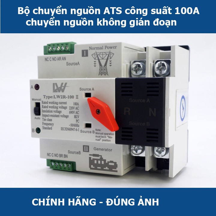 Bộ chuyển nguồn điện tự động ATS 100A 2P 220v không gây mất điện khi chuyển nguồn:Hệ thống điện cấp cho các hộ gia đình cũng như của các công trình thường được cấp điện bởi hệ thống điện lưới (điện ưu tiên) và hệ thống điện dự phòng (máy phát điện, điện năng lượng mặt trời, bình ắc quy). Bình thường nhà, công trình được cấp điện với hệ thống điện ưu tiên (điện lưới) khi hệ thống điện lưới không ổn định hoặc mất điện ta sử dụng hệ thống điện dự phòng để cấp điện cho công trình nhằm duy trì cấp điện liên tục không gián đoạn đến nhà cũng như công trình .Việc chuyển đổi nguồn điện cấp cho nhà thường thông qua bộ cầu dao đảo chiều thủ công nhược điểm của bộ thiết bị này là cồng kềnh không phù hợp lắp trong tủ điện, khi chuyển nguồn sinh ra hồ quang điện gây ra nguy hiểm cho người thao tác măt khác khi chuyển nguồn điện sẽ gây mất điện.