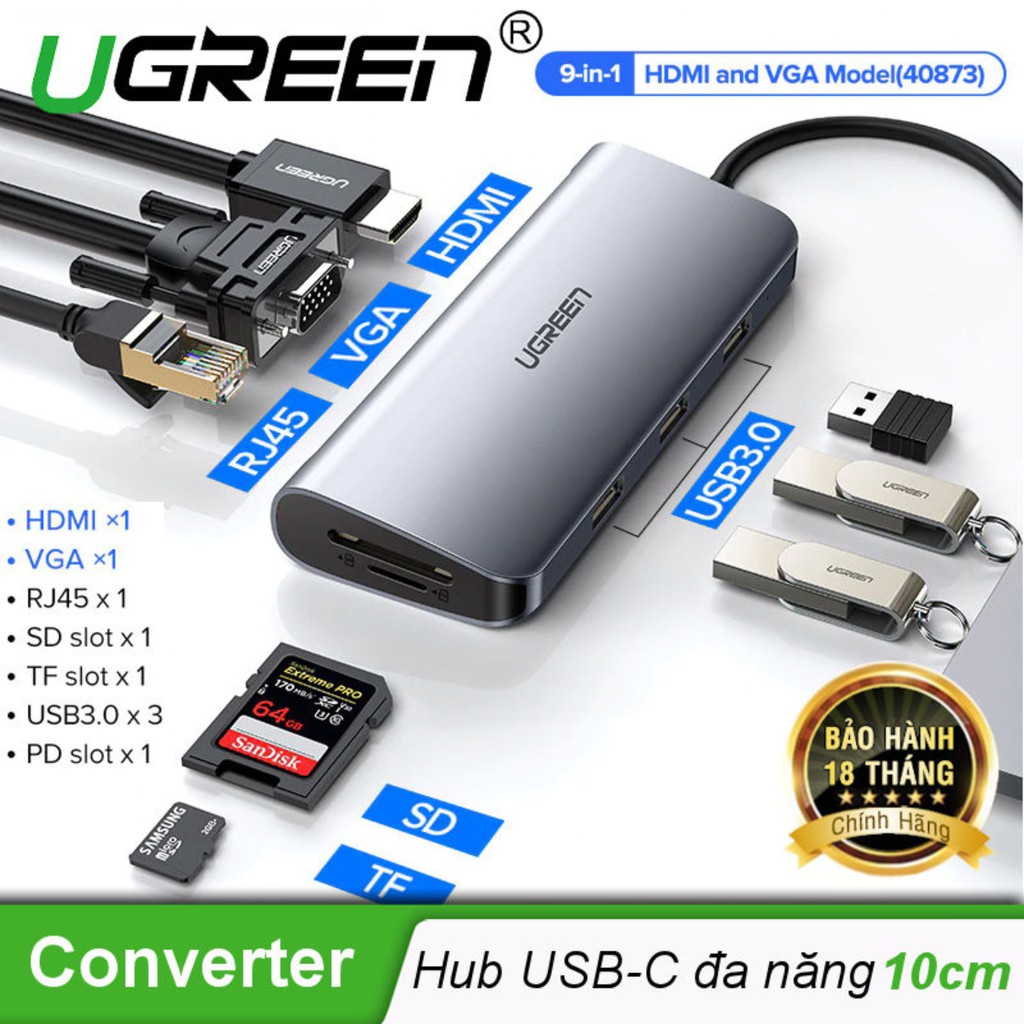 Giới thiệu Bộ chuyển USB Type C 9 in 1 Cao Cấp Ugreen 40873 Chính Hãng CM179