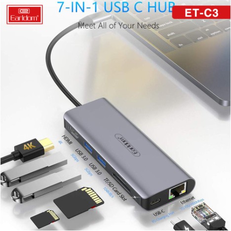 Bộ Chuyển Đổi Cổng Type-C sang HDMI 4k + Usb 3.0 + Ethernet Lan + Thẻ Nhớ cho Macbook, Dell, Smartphone Android- Bộ Hub USB-C chuyển đổi đa năng Earldom từ USB type C sang HDMI 4K + USB 3.0 và Lan Gigabit 100/1000Mbps và hỗ trợ chức năng thẻ nhớ SD và có cổng sạc USB type-C cho máy tính.