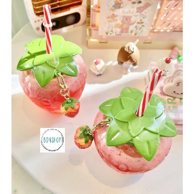 Chai nhựa trái Dâu Tây xinh xắn đựng trà sữa và nước trái cây, có nắp lỗ cắm ống hútChai không kèm Charm và ống hút