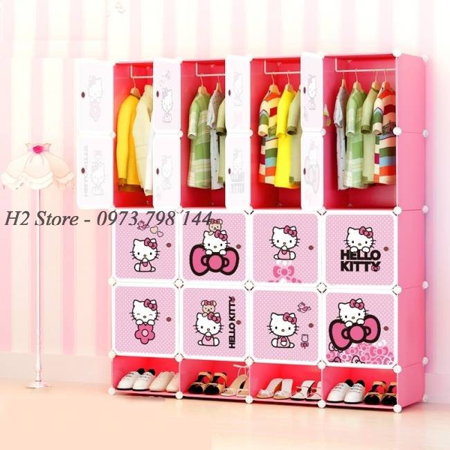 [CÓ ẢNH THẬT] TỦ NHỰA LẮP GHÉP 16 Ô & 4 GIÀY MÀU HỒNG HÌNH KITTY ĐỂ ĐỒ ĐA NĂNG THÔNG MINH sâu 47cm