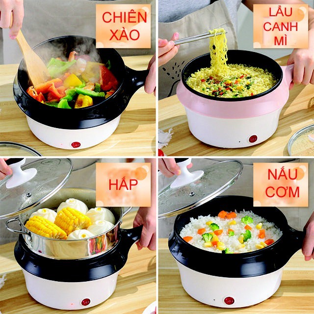 Giới thiệu [CÓ BẢO HÀNH-TẶNG LỒNG HẤP] Ca nấu mì nồi lẩu điện mini có lồng hấp 18cm 2 lớp- ca nấu mì siêu tốc -Nồi lẩu điện ca mì c