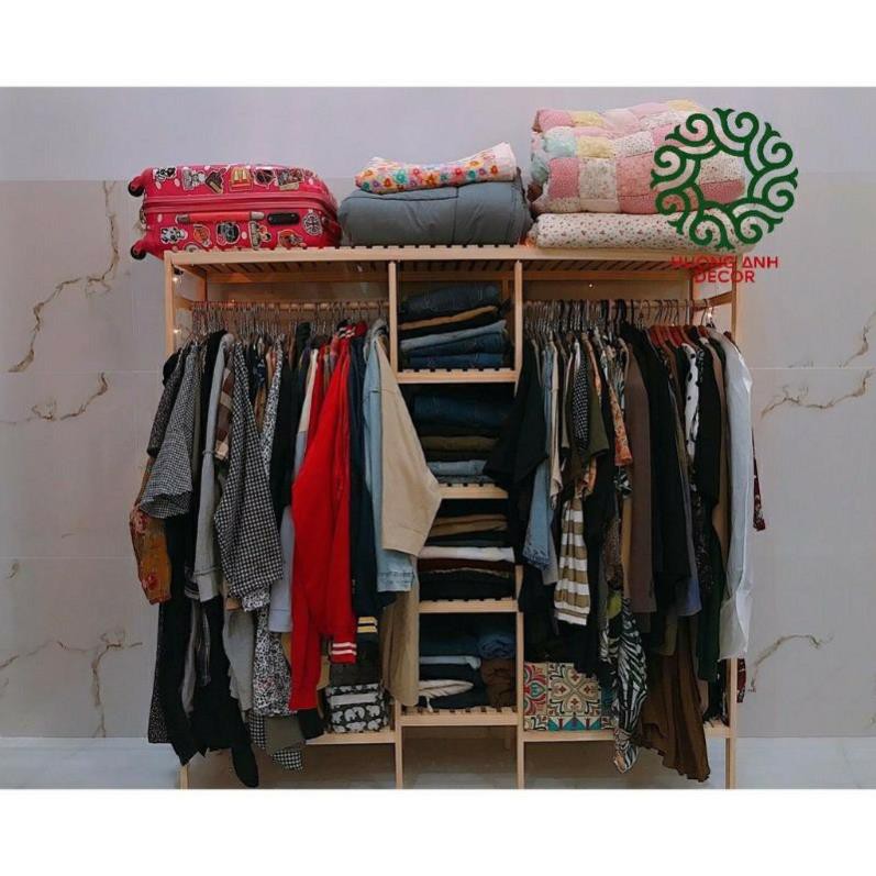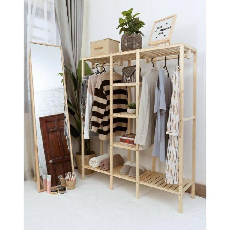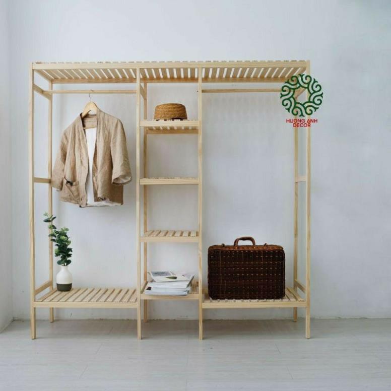 - Giá kệ gỗ treo quần áo có thiết kế thông minh, tiện lợi khi sử dụng: vừa treo móc được nhiều quần áo, có thêm ngăn kệ ngang chia tầng bằng gỗ bản lớn chắc chắn, để chứa giày dép hoặc cất giữ các đồ vật nặng. Tiết kiệm diện tích không gian.