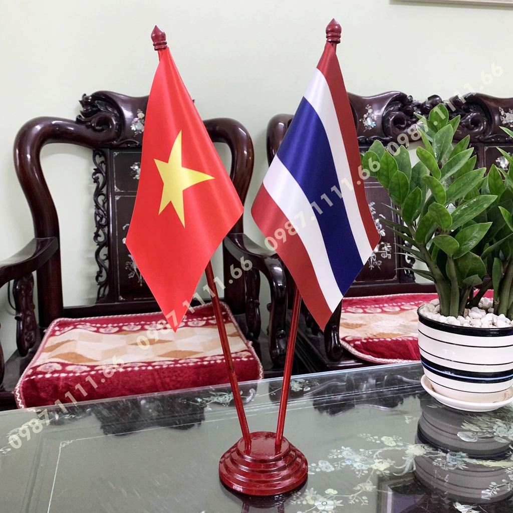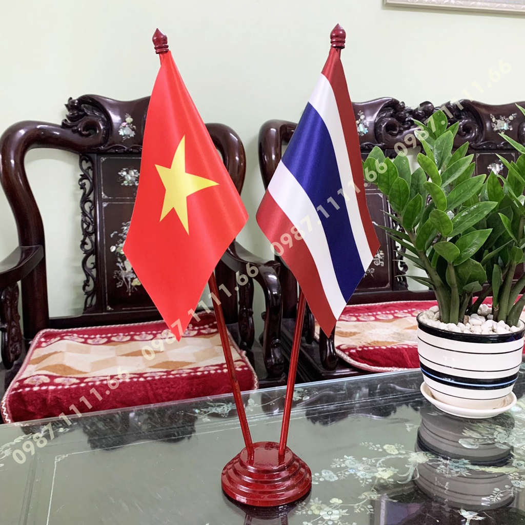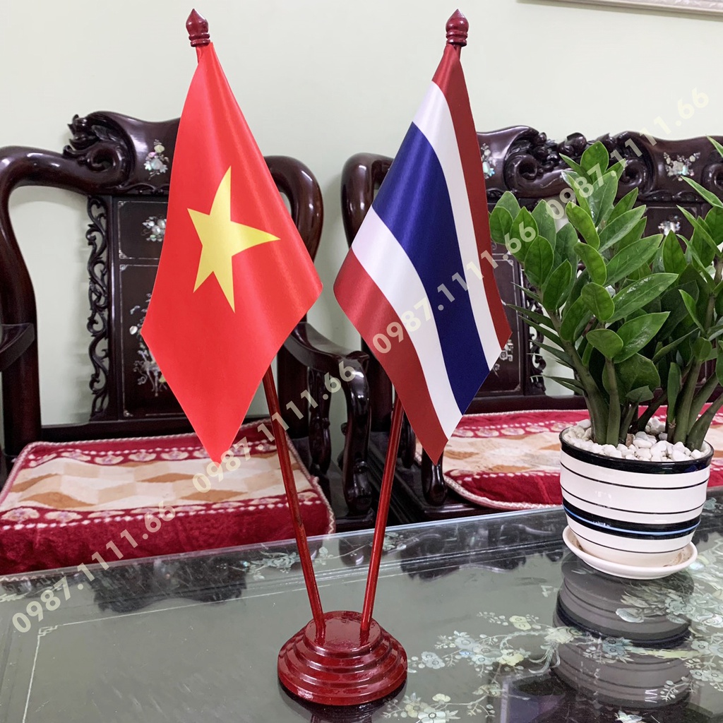 Giới thiệu Cờ Để Bàn Đế gỗ Cắm 2 cờ Việt Nam - Thái Lan In Kỹ Thuật Số 3D Vải Phi Bóng