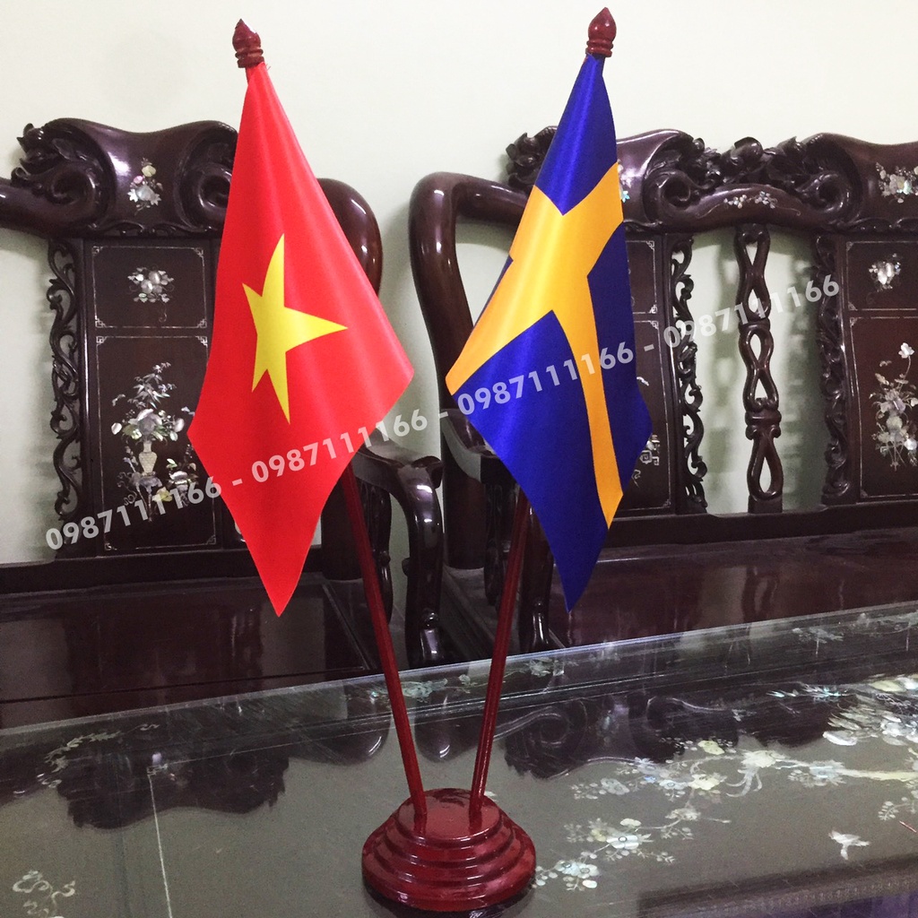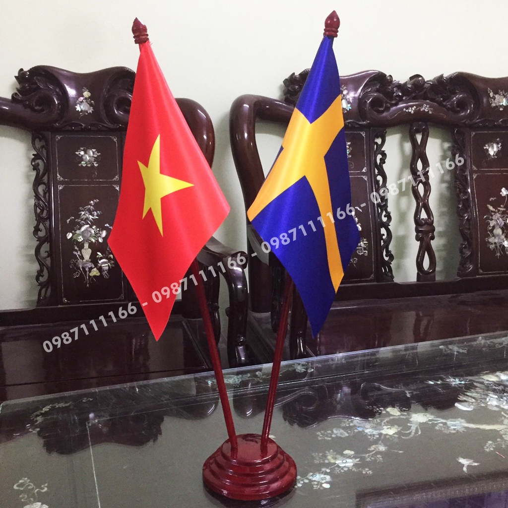 Cờ Để Bàn Đế gỗ Cắm 2 cờ Việt Nam - Thụy Điển In Kỹ Thuật Số