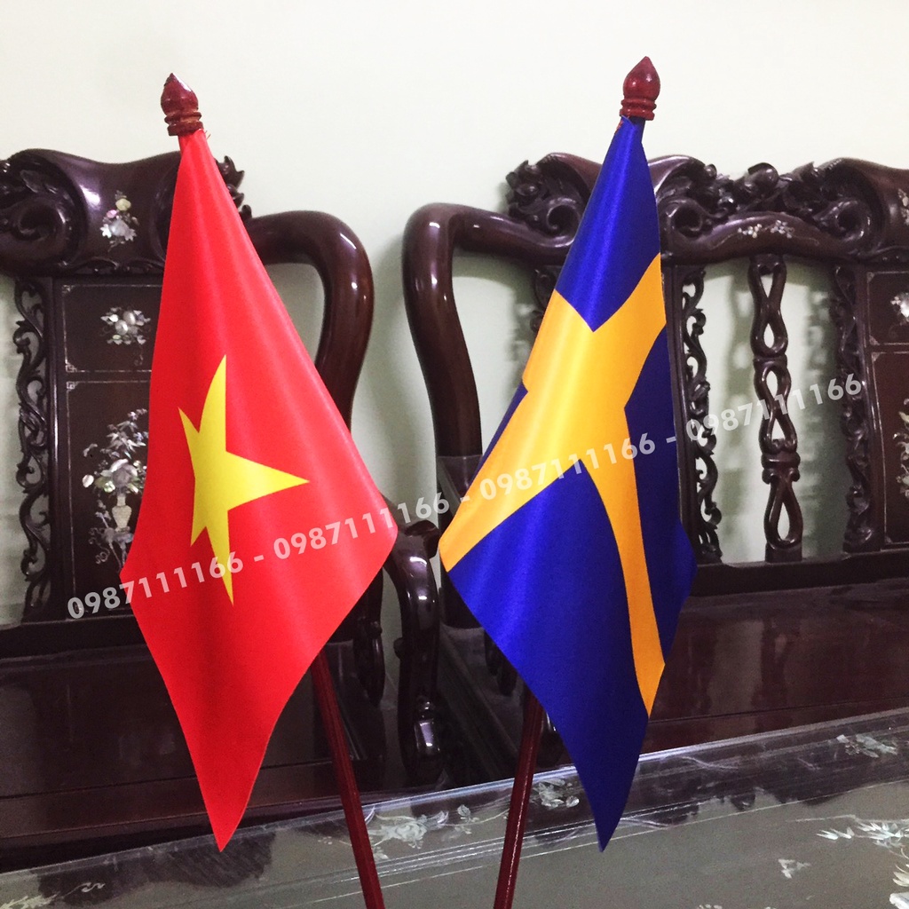 Giới thiệu Cờ Để Bàn Đế gỗ Cắm 2 cờ Việt Nam - Thụy Điển In Kỹ Thuật Số