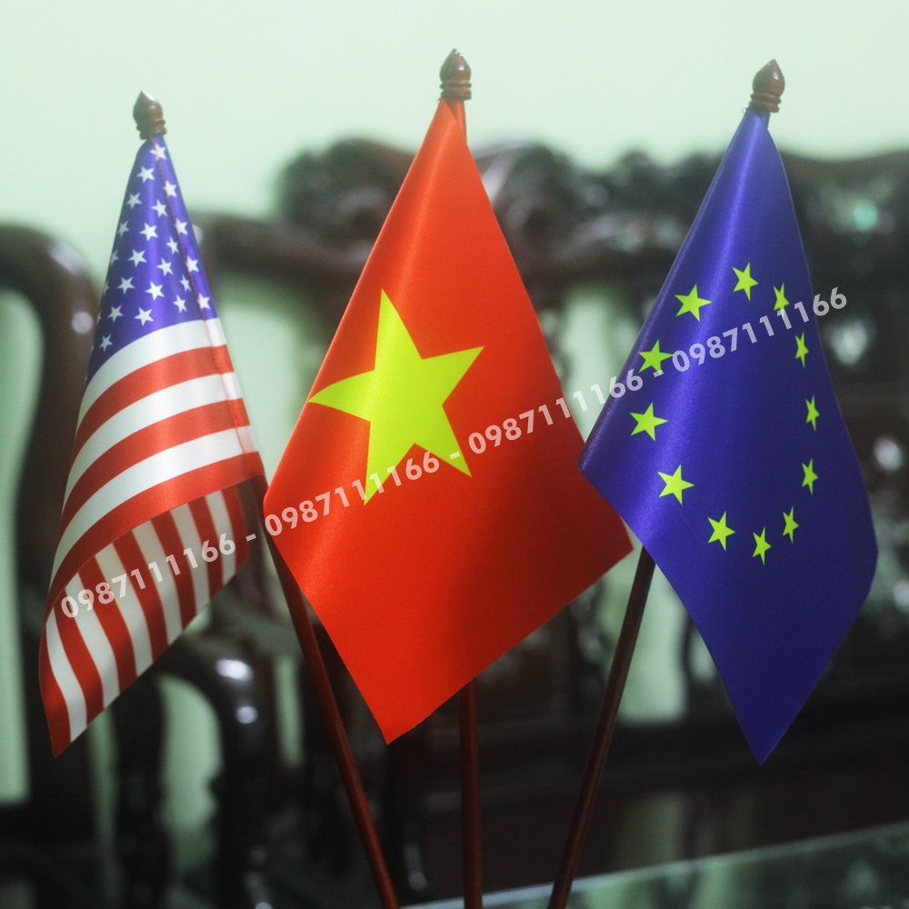 Cờ Để Bàn Đế gỗ Cắm 3 cờ Liên Minh Châu Âu - Việt Nam - Mỹ In Kỹ Thuật Số 3D