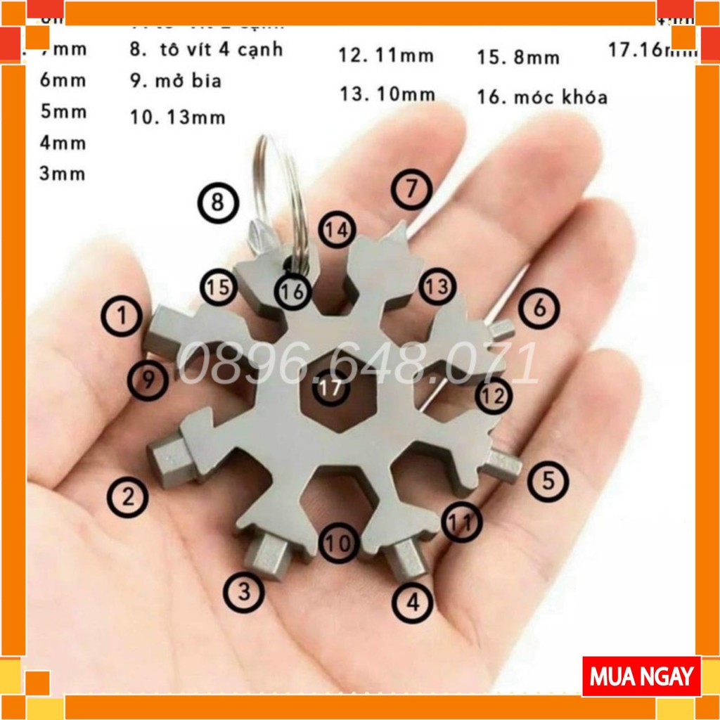 Cờ lê lục giác đa năng 18 in 1 hình bông tuyết tích hợp cờ lê 6mm, 7mm, 8mm , 9mm , 10mm , 11mm, 12mm, 14mm, đầu lục lăng 3mm, 4mm, 5mm ,6mm, 7mm , 8mm, tuốc nơ vít 2 cạnh, tuốc nơ vít 4 cạnh, dụng cụ mở nắp chai, dụng cụ mở hộp, móc chìa khóa làm quà tặng.Kích thước: 65mm x 65mm x 6mm.