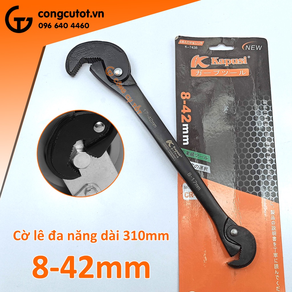 Cờ lê đa năng 8-42mm dài 310mm Kapusi K-7438 thiết kế thông minh với khả năng xoay vặn nhiều vật dụng từ bu lông đến các loại đường ống.Vặn được tất cả các bu lông, ống nước từ 8-42mm.