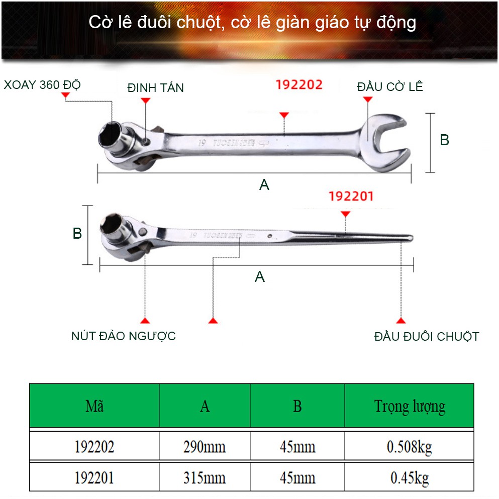 Nhà cửa & Đời sống > Dụng cụ & Thiết bị tiện ích > Dụng cụ > Bộ cờ lê || Cờ lê đuôi chuột thông minh 19-22mm, cờ lê giàn giáo, Lắc tự động, có công tắc đảo chiều, chính hãng TUOSENCòn hàng