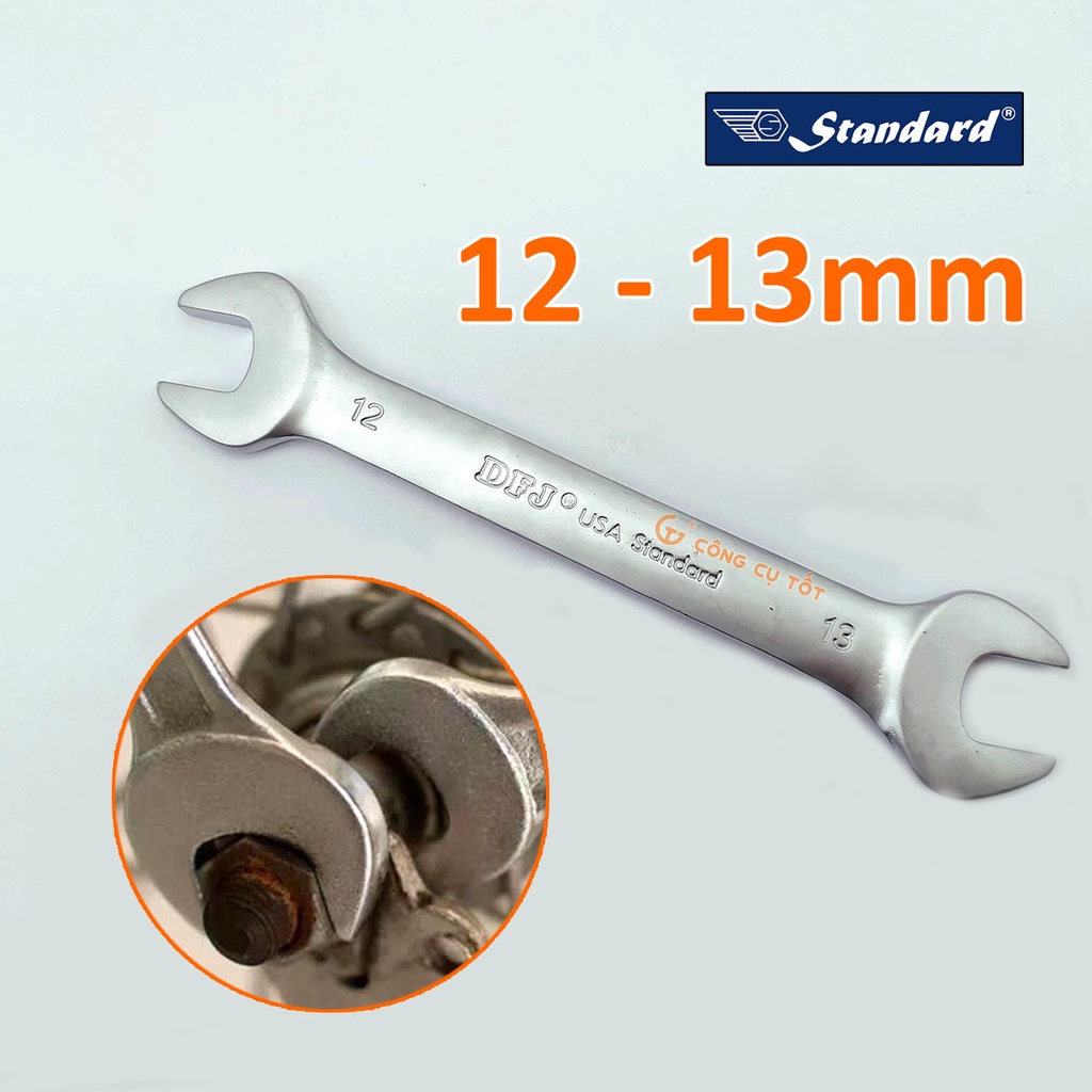 Cờ lê hai đầu mở 12-13 thép CrV rèn dập nóng DFJ USA Standard được làm từ thép Chrome - Vanadium nên có độ cứng rất cao, chịu được nhiệt, chịu lực tốt, có 2 đầu vặn phù hợp với các loại ốc vít, bu lông cỡ 12mm và 13mm. Sản phẩm là một dụng cụ phổ biến, có tính năng ứng dụng cao thường được dùng trong việc sửa chữa máy móc, thiết bị,...Có 2 đầu vặn phù hợp với các loại ốc vít, bu lông kích cỡ 12mm và 13mm.
