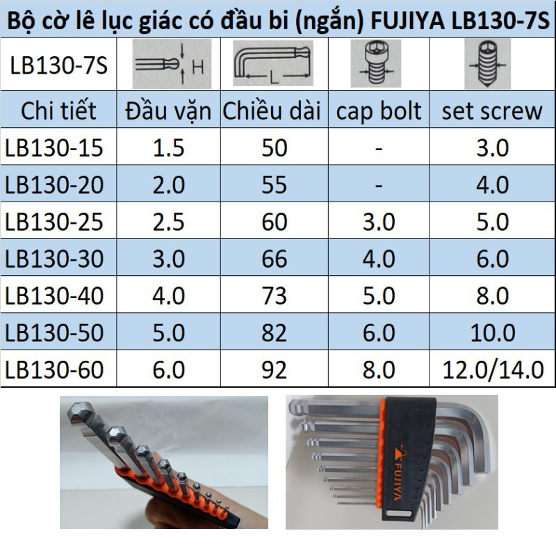 Bộ cờ lê lục giác có đầu bi (ngắn) FUJIYA LB130-7S được sản xuất theo chất lượng tiêu chuẩn Nhật Bản.THÔNG SỐ KỸ THUẬT: