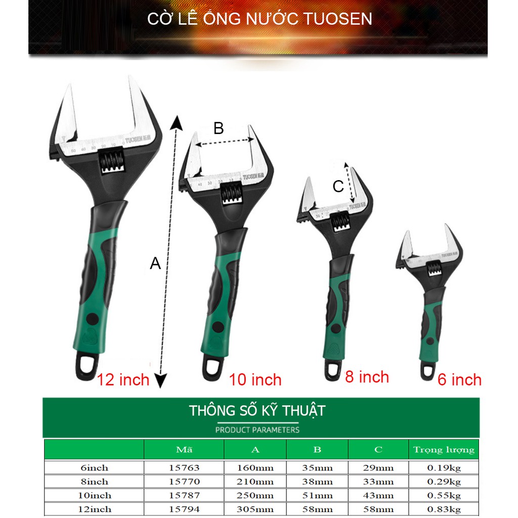 Giới thiệu Cờ lê ống nước, cờ lê chậu rửa, cờ lê mở lớn đa năng TUOSEN 6inch, 8inch, 10inch, 12inch (cán xanh)