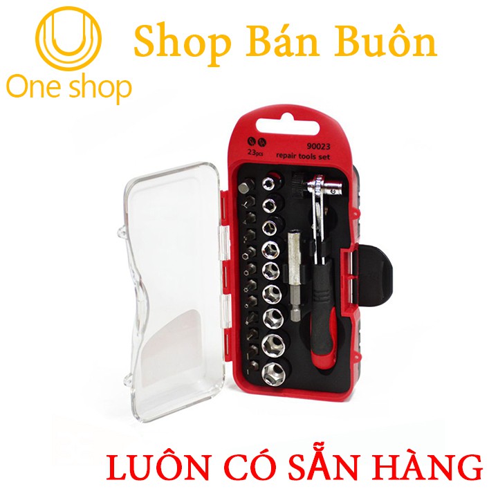 Bộ Cờ Lê Tô Vít Sửa Chữa Đa Năng 23 Chi Tiết LC- 90023Bộ cờ lê, tô vít sửa chữa đa năng 23 chi tiết, có 12 đầu vít đủ các loại từ đầu dẹt, bake, hoa thị... với nhiều kích cỡ có thể mở được nhiều loại ốc vít khác nhau. 9 đầu tuýp dùng để mở các loại ốc lục giác ngoài, có kích thước từ 5mm- 12mm. Các đầu vặn của bộ dụng cụ sửa chữa được làm từ vật liệu cao cấp, chống gỉ. Ngoài ra bộ còn có 1 đầu nối dài, và 1 tay cầm được thiết kế với bánh cóc giúp bạn tháo lắp các loại ốc vít nhanh chóng và dễ dàng hơn. Tay cầm cũng được bọc 1 lớp cao su nhằm giúp quá trình làm việc của bạn được thoải mái hơn.