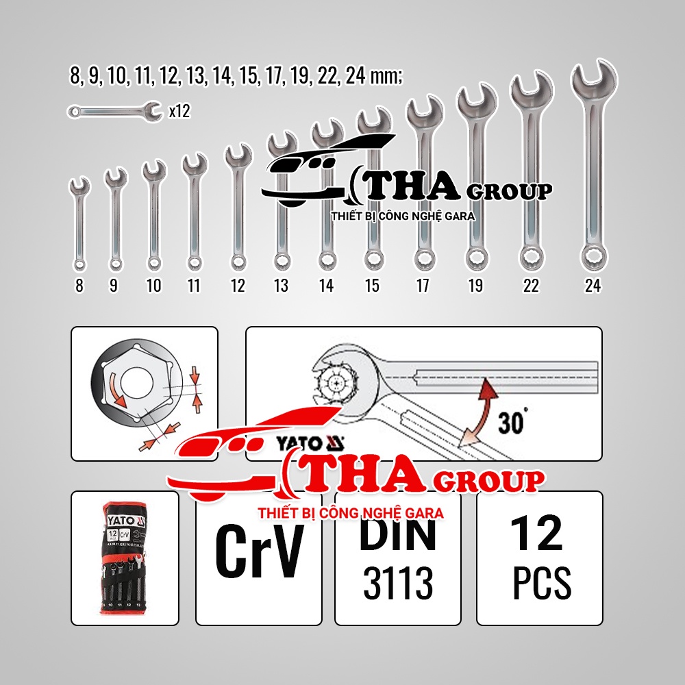 Bộ gồm 12 chi tiết cờ lê có kích cỡ lần lượt là 8; 9; 10; 12; 13; 14; 15; 17;19; 22; 24mm có màu trắng bạc, được làm từ thép hợp kim CrV, đồ bền cao, không hoen gỉ trong quá trình sử dụng. Ngoài ra còn được tráng sơn tĩnh điện bóng làm tăng độ bền cho sản phẩm.
