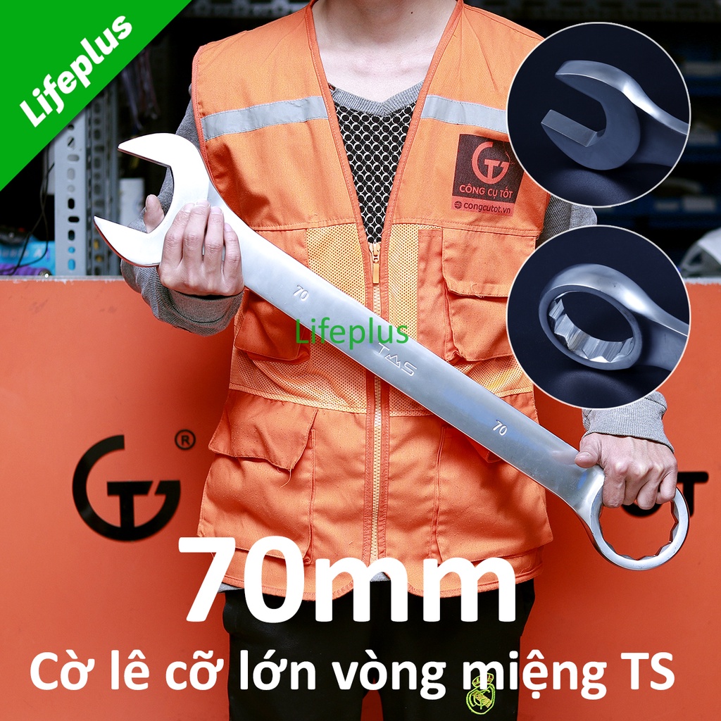 Cờ lê vòng miệng TS 70mm là loại cờ lê có kích thước cực lớn. Ta chỉ có thể thấy cờ lê TS cỡ lớn ở các xưởng đóng tàu, xưởng sửa chữa phương tiện vận tải cỡ lớn, nhà máy, ...Kích thước: 70mm.