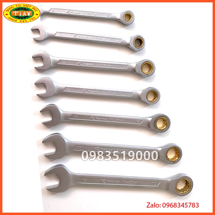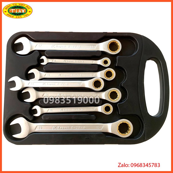 -Bộ cờ lê vòng miệng tự động đảo chiều hãng Kapusi Nhật Bản 7 chi tiết - Bộ cờ lê tròng cóc Kapusi (Bộ chìa khóa)Bộ cờ lê vòng miệng tự động đảo chiều 7 chi tiết hãng Kapusi Nhật Bản bao gồm các kích cỡ sau: 8-10-12-13-14-17-19mm