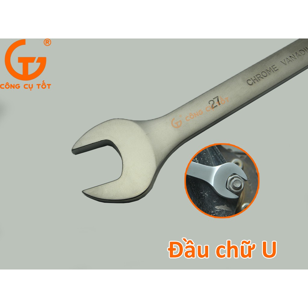 Được làm từ hợp kim thép Cr-V có độ cứng cao, chịu lực, chống cắt tốtThiết kế 2 đầu : 1 đầu chữ U và 1 đầu tròng cùng kích thước 37mm