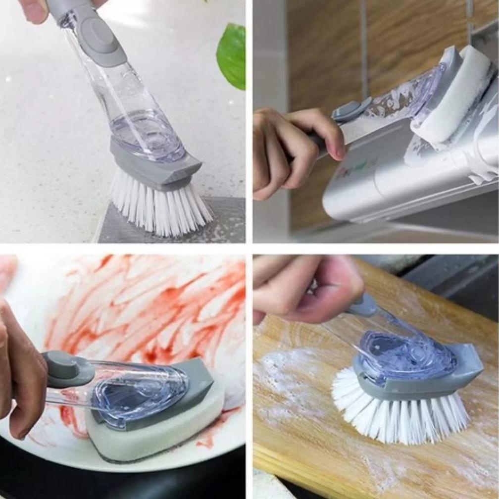 Cọ rửa bát 2 đầu có cán đựng xà phòng đa năngDụng cụ làm sạch đa năng kèm bình xịt này có một bầu đựng xà phòng rửa chén bát ở tay cầm, khi bạn cọ xoong nồi, nước rửa chén sẽ tự động phun ra đồ được rửa, giúp tẩy cọ thật nhanh và sạch. Bạn chỉ cần cho một lượng xà phòng rửa bát rất ít, sau khi cho vào bầu đựng, bạn đổ thêm ít nước vào và lắc nhẹ rồi sử dụng. Đây là một cách rửa sạch xoong nồi tiện ích mà lại tiết kiệm nữa.