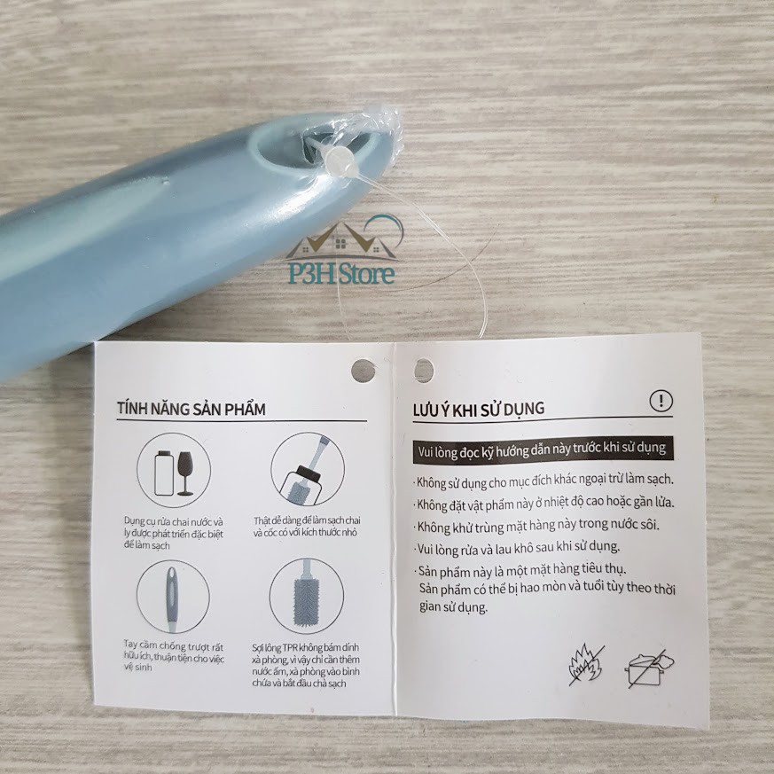 - Dụng cụ cọ bình được thiết kế đặc biệt với cọ lông nhựa TPR đầu gai dày và mềm , dễ dàng đánh bay cặn bám mà ko làm trầy xước bình .
