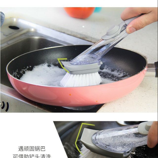 ➡ Sử dụng dễ dàng: tháo miếng cọ, đổ nước rửa vào phần chứa ở tay cầm, lắp lại & không lo hết nước rửa.